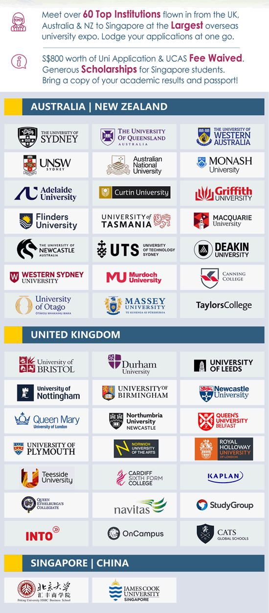 :: Calling all O/A-Level, Polytechnic, Local U students in Singapore :: Meet over 60 institutions flown in from the UK, Australia and New Zealand in person at the largest overseas university expo in Singapore: The Global University Expo 2026 to find out more about your options and lodge application to many elite universities from the UK & Australia at one go: