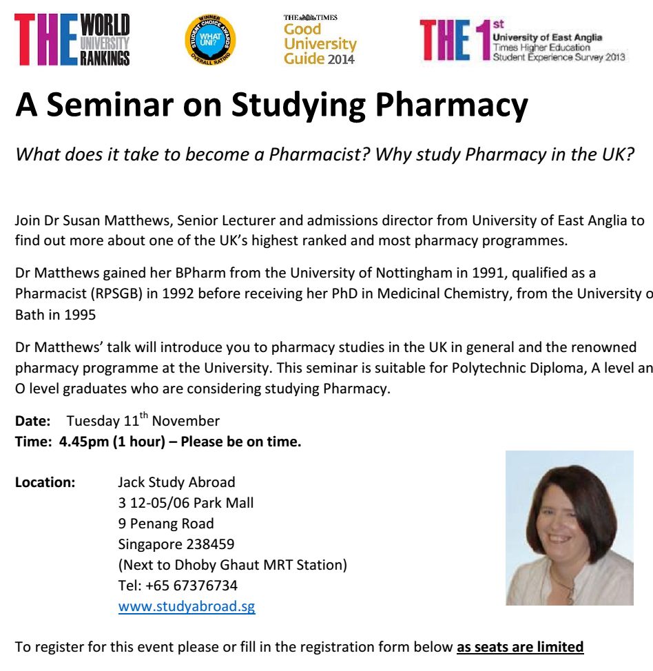 Dr Matthews’ talk will introduce you to pharmacy studies in the UK in general and the renowned pharmacy programme at the University. This seminar is suitable for Polytechnic Diploma, A level and O level graduates who are considering studying Pharmacy.