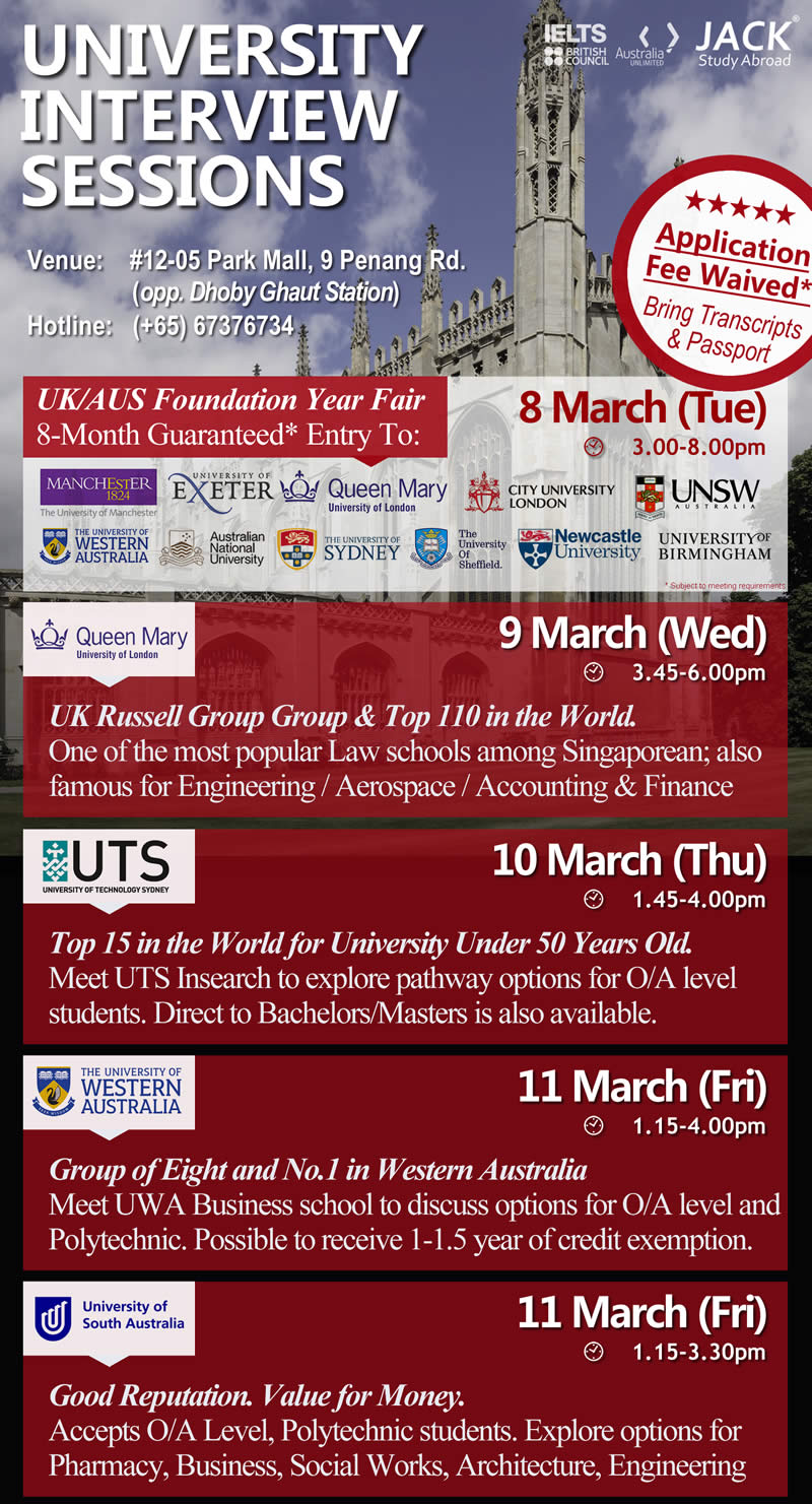 We have invited these universities to come to Singapore to meet/interview students. If you are consider studying overseas, please make yourself available at of the sessions:
