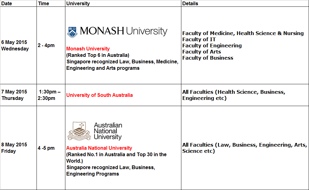 Please register now for 30 min 1-to-1 meeting with the university above. Seats are limited. Please call 67376734 for registration.